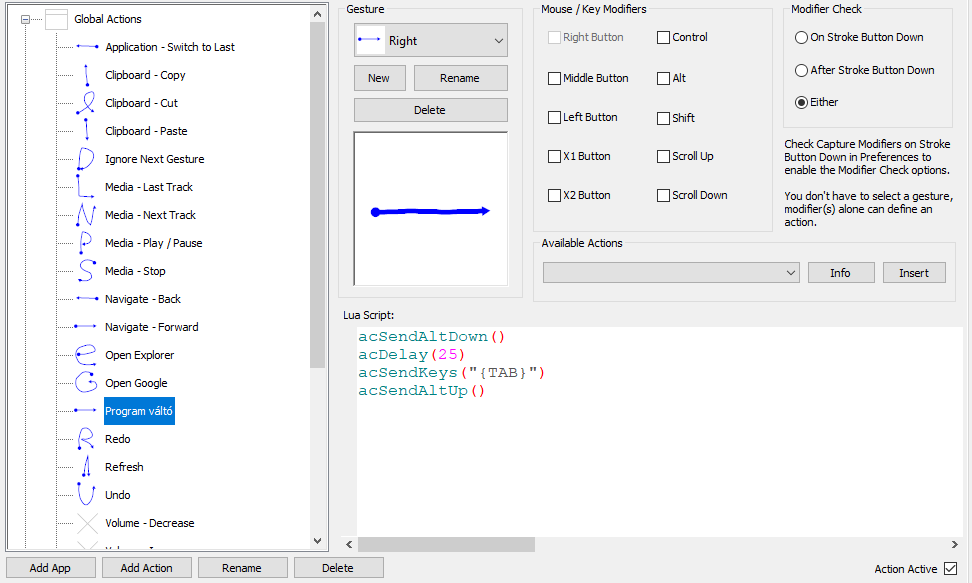 acSendAltUp() - gesture: "Right". Egy pontból kiinduló jobbra mutató nyíl. Ha ez már felhasználásra került a bal oldali listában, akkor vagy válassz másikat, vagy a másikat töröld, vagy módosítsd!