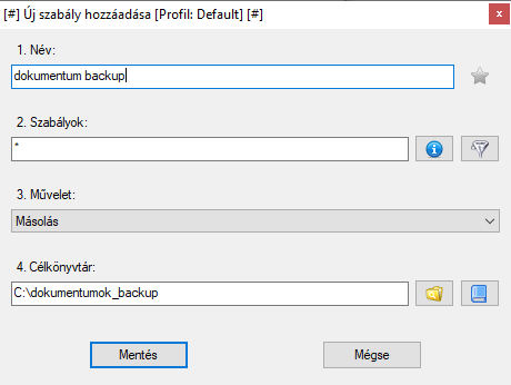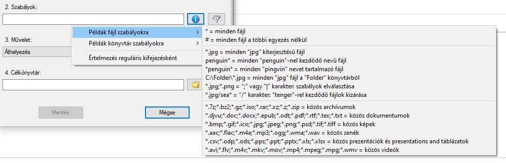 Megadható, hogy milyen feltételek alapján keresse ki a fájlokat, amelyekkel dolgozik majd. Az "i" gombra kattintva egy halom minta szabály használható.