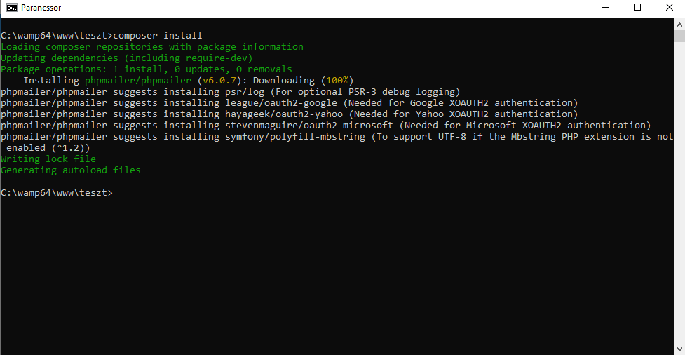 Ezt követően ABBAN A MAPPÁBAN állva ki kellene adni a telepítési parancsot (composer install) parancssorból, ahol a composer.json is van: