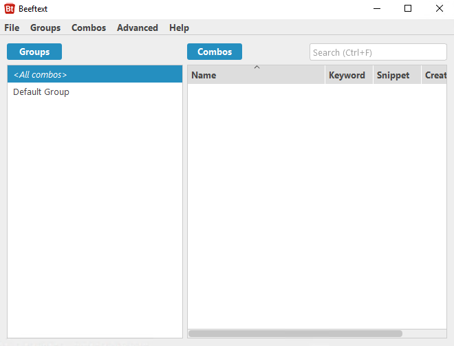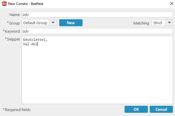 Egy gyorsszöveg a "Combos > New" választásával hozható létre. Például így: