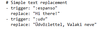 A trigger a rövid szöveg, ami mindig kettősponttal kezdődik és a replace után van a szöveg, amire cseréli. Mindkettő idézőjelek között.