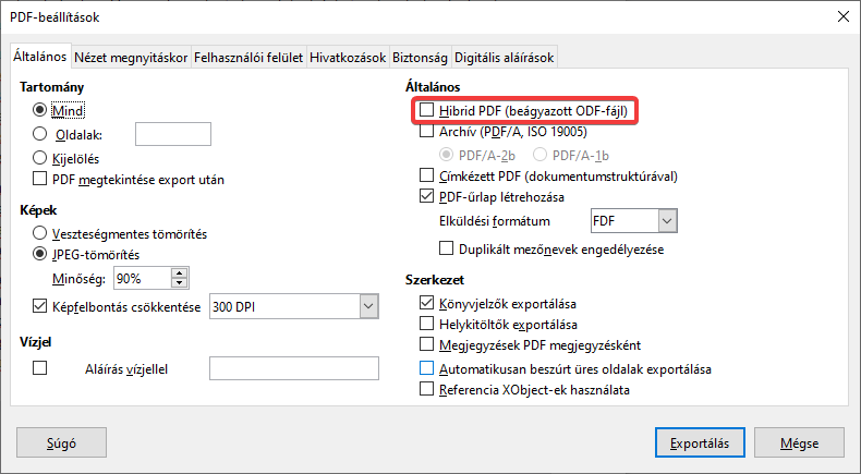 Hasznos, hogy megoldható az is, hogy az eredeti dokumentumot a pdf-be ágyazzuk, odf formátumban. Ez a normál pdf olvasók számára nem probléma, nekünk viszont hasznos, mert később szerkeszthető a Writer-rel is a pdf.