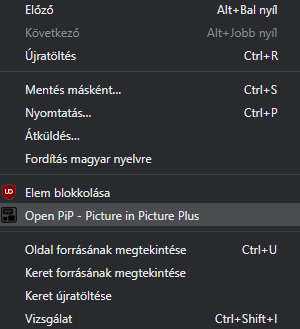 A telepítése után a weboldal egy üres részén jobb egérrel kattintva megjelenik az "Open PiP - Picture in Picture Plus". Kattintásra kiragadja a videót.