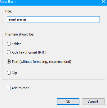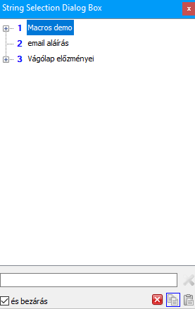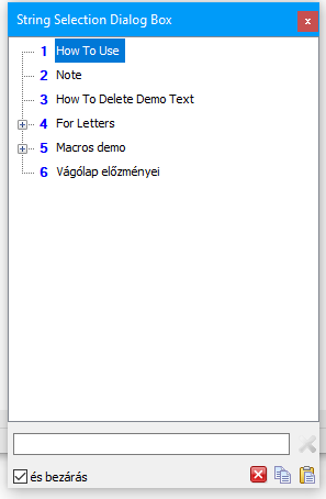 Mint látható, van pár előre rögzített szöveg, de ezek törölhetők majd. Alul van egy kereső és a számokkal is működik a kiválasztás, a beillesztés pedig ENTER-rel, vagy dupla klikkel.