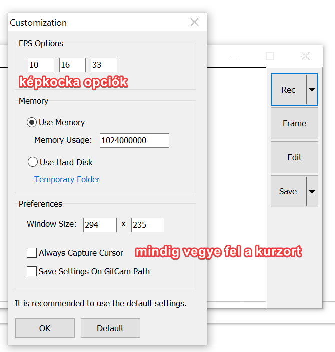 A felvételre kerülő részletet maga a program ablaka adja, azt kell átméretezni.