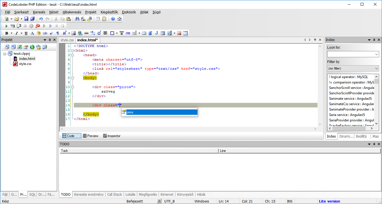 Felismeri a saját kódjainkat, pl. a CSS class-okat (de ehhez projektet kell létrehozni a projekt menüben!)
